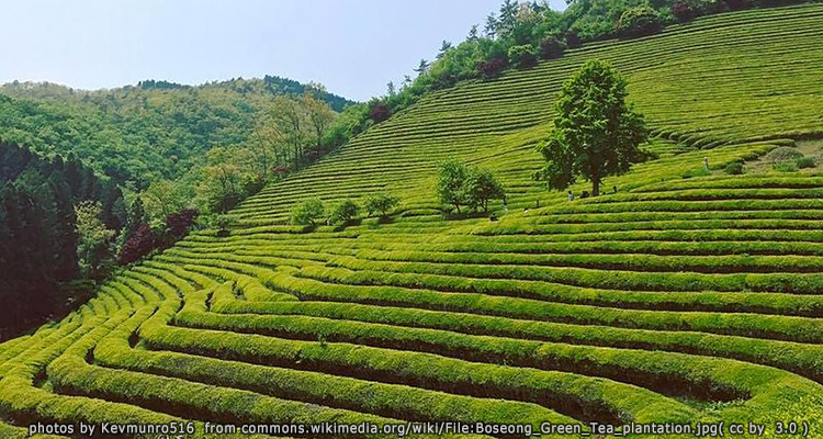 4. ไร่ชาเขียวโบซอง แหล่งปลูกชาเชียวขนาดใหญ่ของเกาหลีซึ่งปลูกบนภูเขาอยู่ทางตอนใต้ของโบซอง ทำให้มองเห็นไร่ชาเป็นแนวสีเชียวสูงต่ำสลับกันไปตามแนวภูเขา